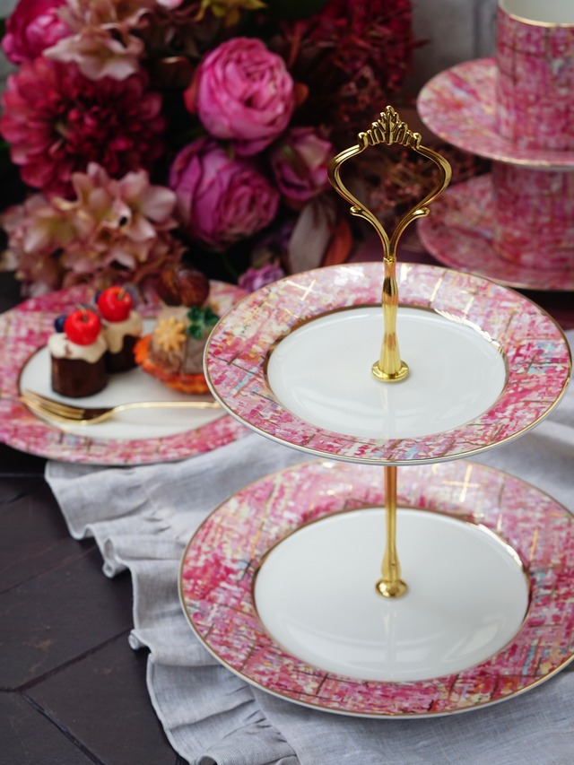 アンティーク風の2段ケーキスタンド。 ポーセラーツの技法で作られた美しいデザインが、おしゃれなティータイムやパーティーを演出します。 上下の2段式なので、 ケーキやスイーツを見栄えよく盛り付けることができます。 おしゃれなお店のような雰囲気をお家に取り入れたい方にもおすすめです。 また、プレゼントとしても喜ばれること間違いなしです。 【サイズ】 高さ : 3.60 cm 横幅 : 23.50 cm 奥行 : 23.60 cm *お写真は明るめに撮影しております。 撮影の光の加減や お使いの端末やPC環境により写真と実物の色味や質感が異なって見えることがございます。