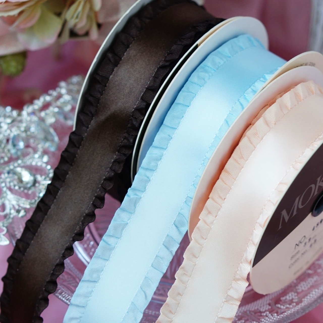 お洋服やバッグなどの装飾やハンドメイド品にもおすすめな上質で可愛いフリルリボンです。